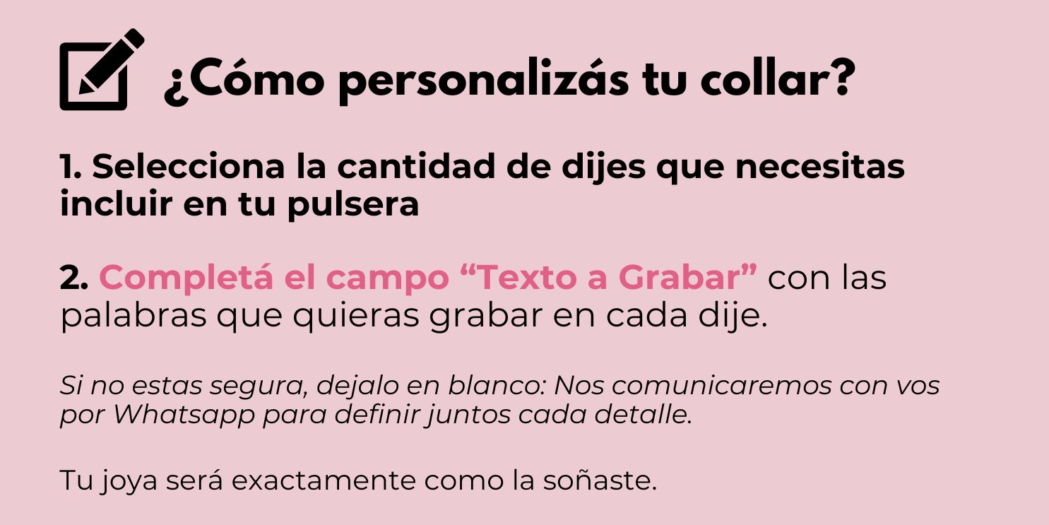 Algunas ideas para grabar: Pueden ser nombres de sus hijos, nietos, personas especiales, o palabras que la describan o quieras que siempre la acompañen por siempre.