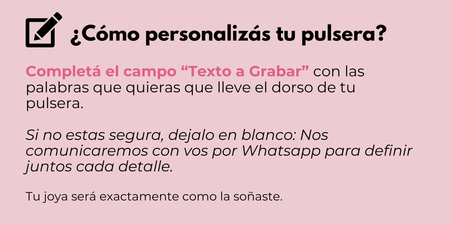Información importante: Por la medida de la pulsera no te preocupes, al recibir la compra nos comunicamos con vos vía Whatsapp para que tomemos juntas la medida, de esta manera tu nueva pulsera te quedará perfecta 😉